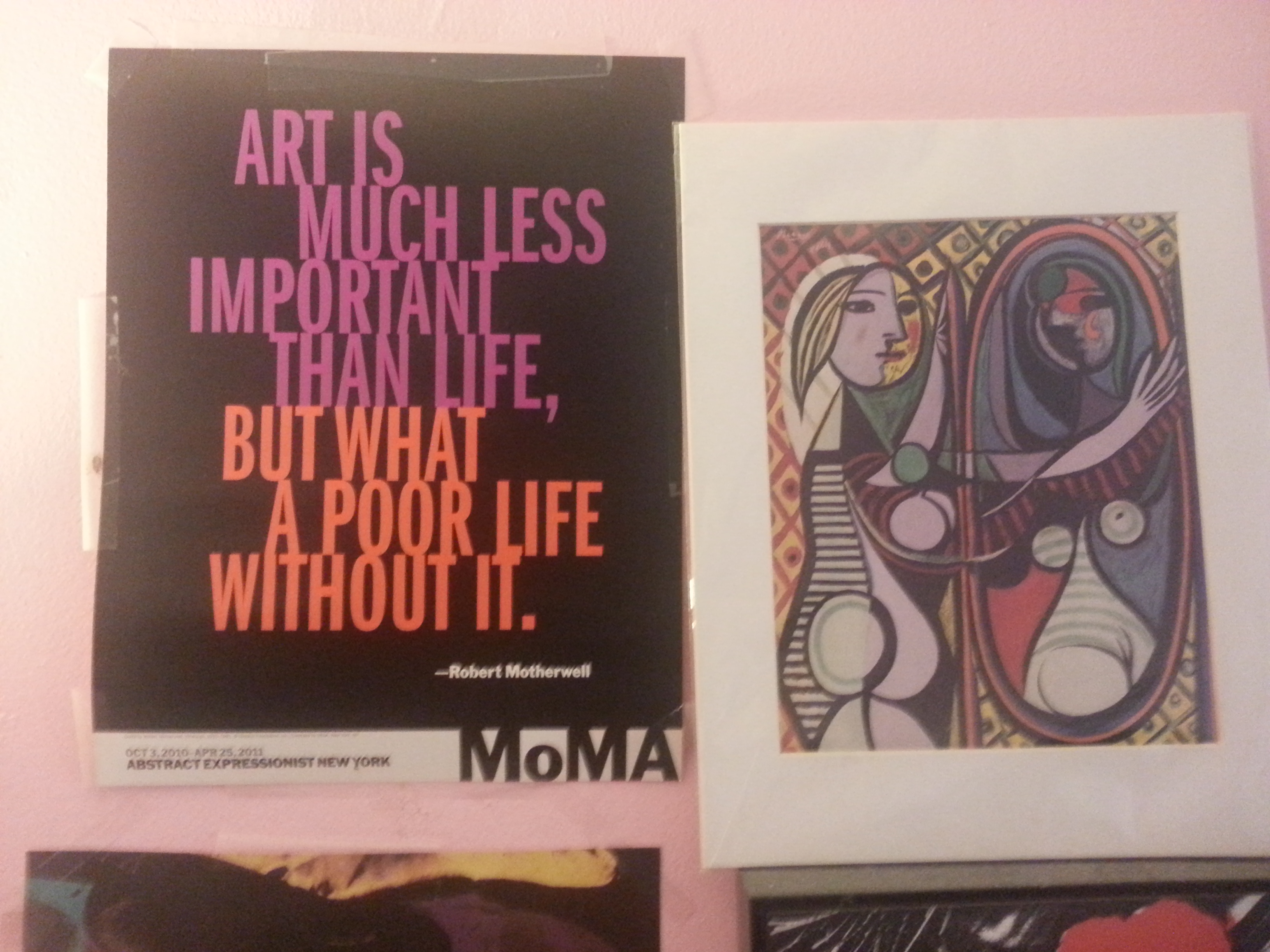 I have always believed that art is an important piece of the puzzle of life. Without art, I would not be complete. (Two of many posters/images on my wall)Quote by Robert Motherwell (on the left) Copyright MoMA or Museum of Modern Art. From their Abstract Expressionist New York Exhibit Oct 3,2010 – April 25, 2011; (On the right) Pablo Picasso’s “Girl Before a Mirror” Also, purchased at the MoMA.